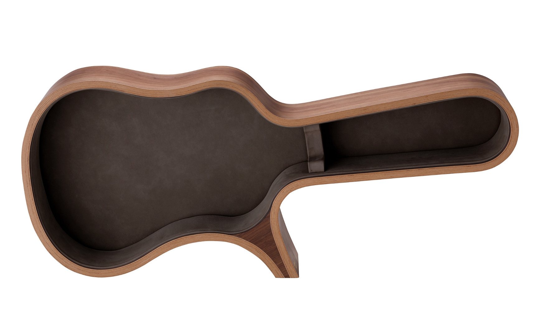 クラシックギターを収納するギターフレームです。クラシックギターの形に沿って積層材を湾曲させ形成しており、腰掛ける演奏していただけるベンチとして、ご使用いただけます。